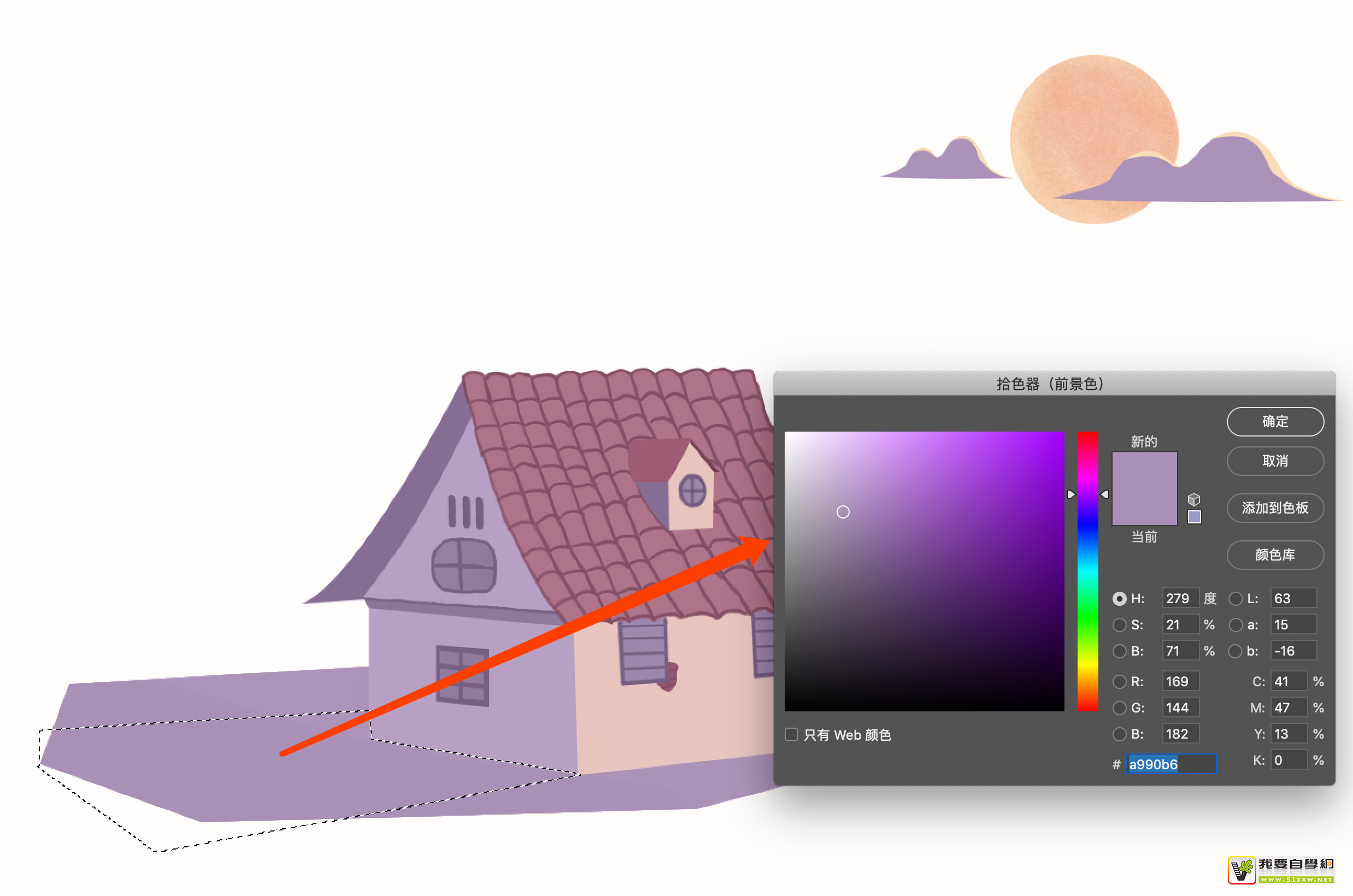 - 吸取屋檐的紫红色,因为它的投影会影响到下面,所以我设定它会带有环境色