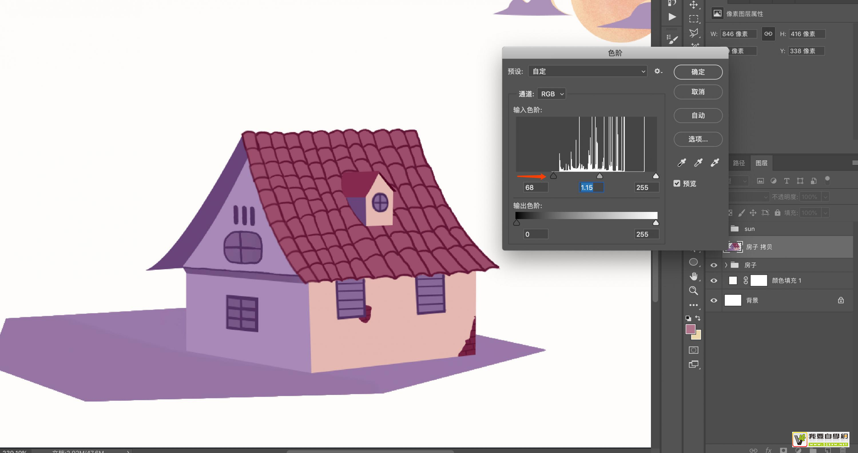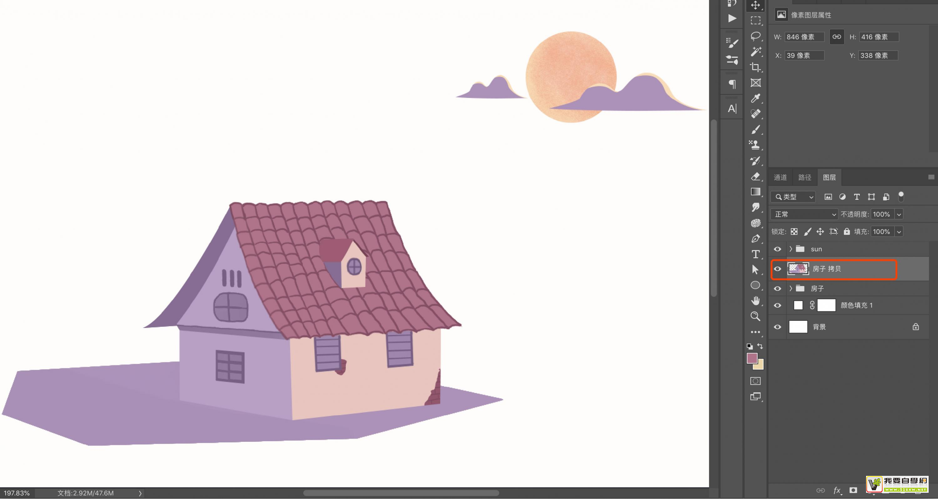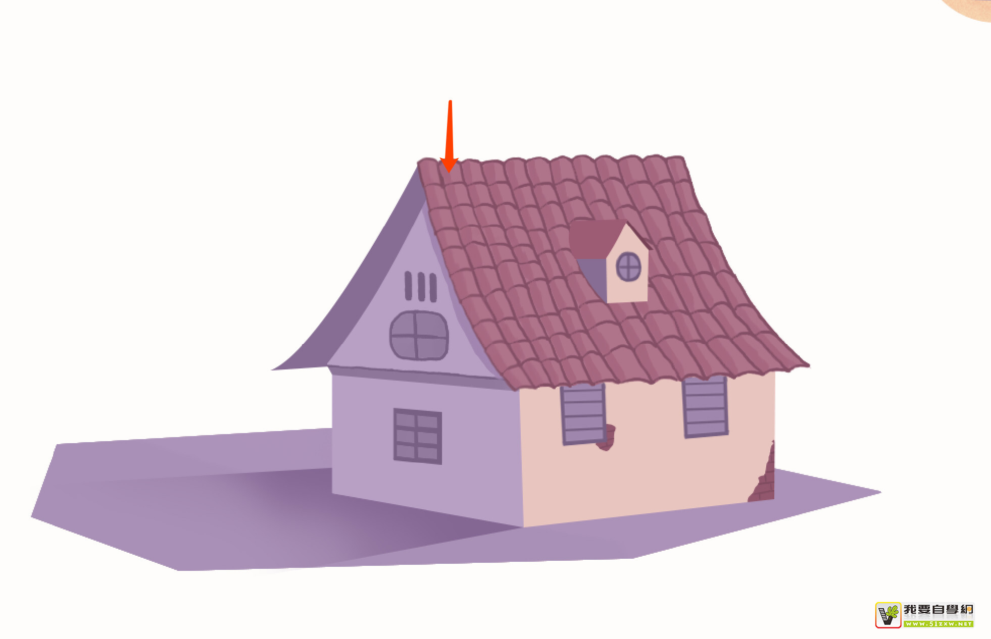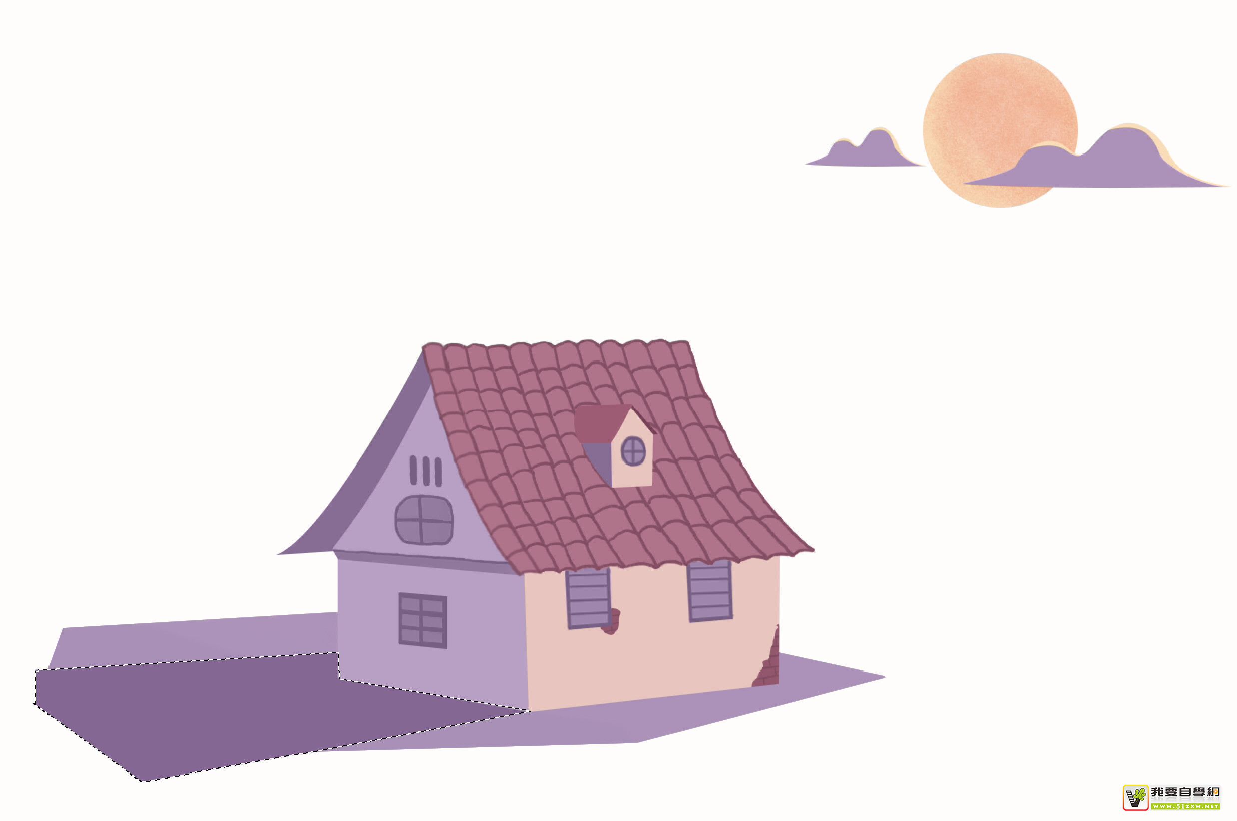 比如我要给房子加上地面的投影,阳光设定在右上方,所以投影的方向跟着光的方向一致: