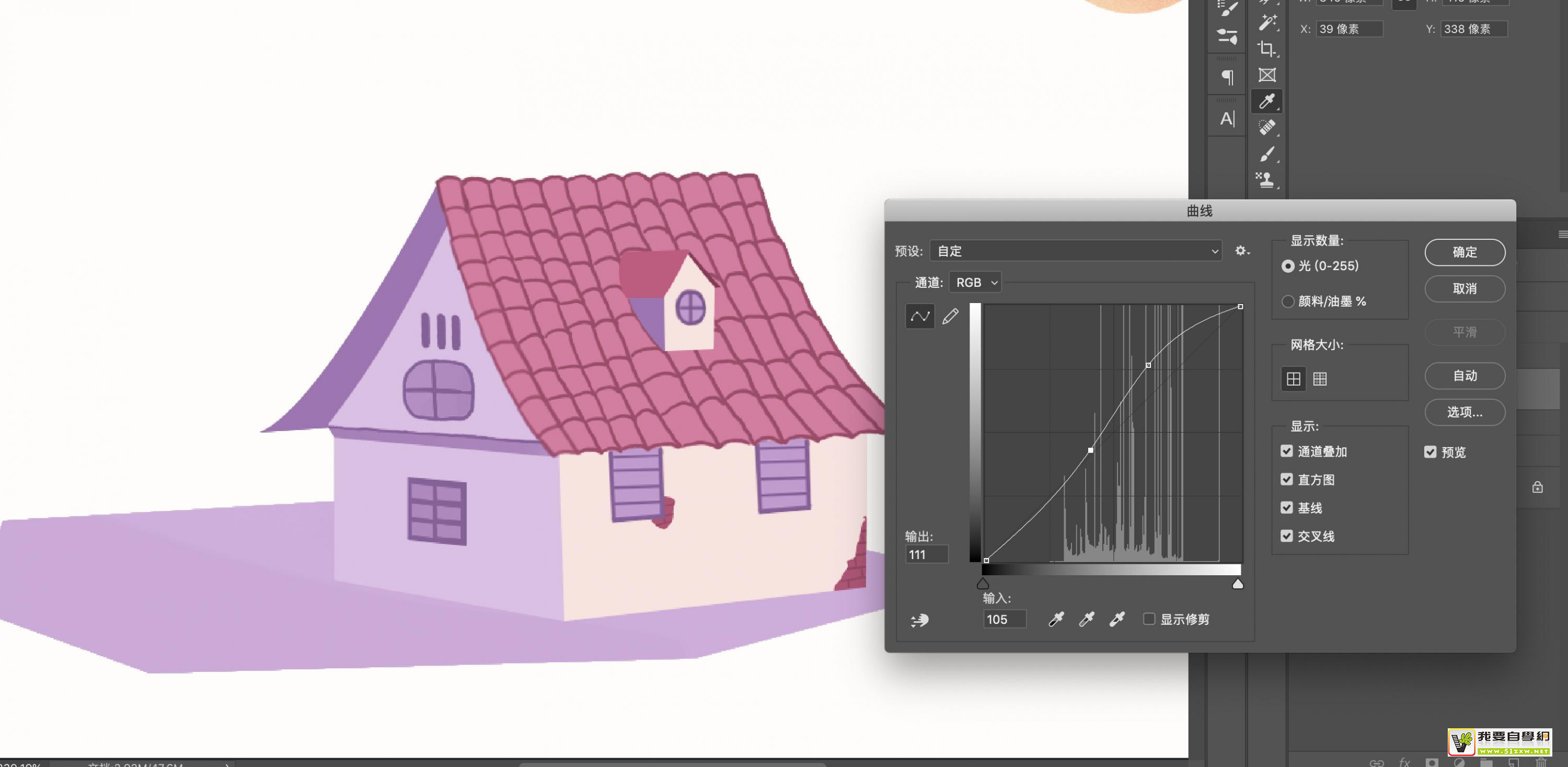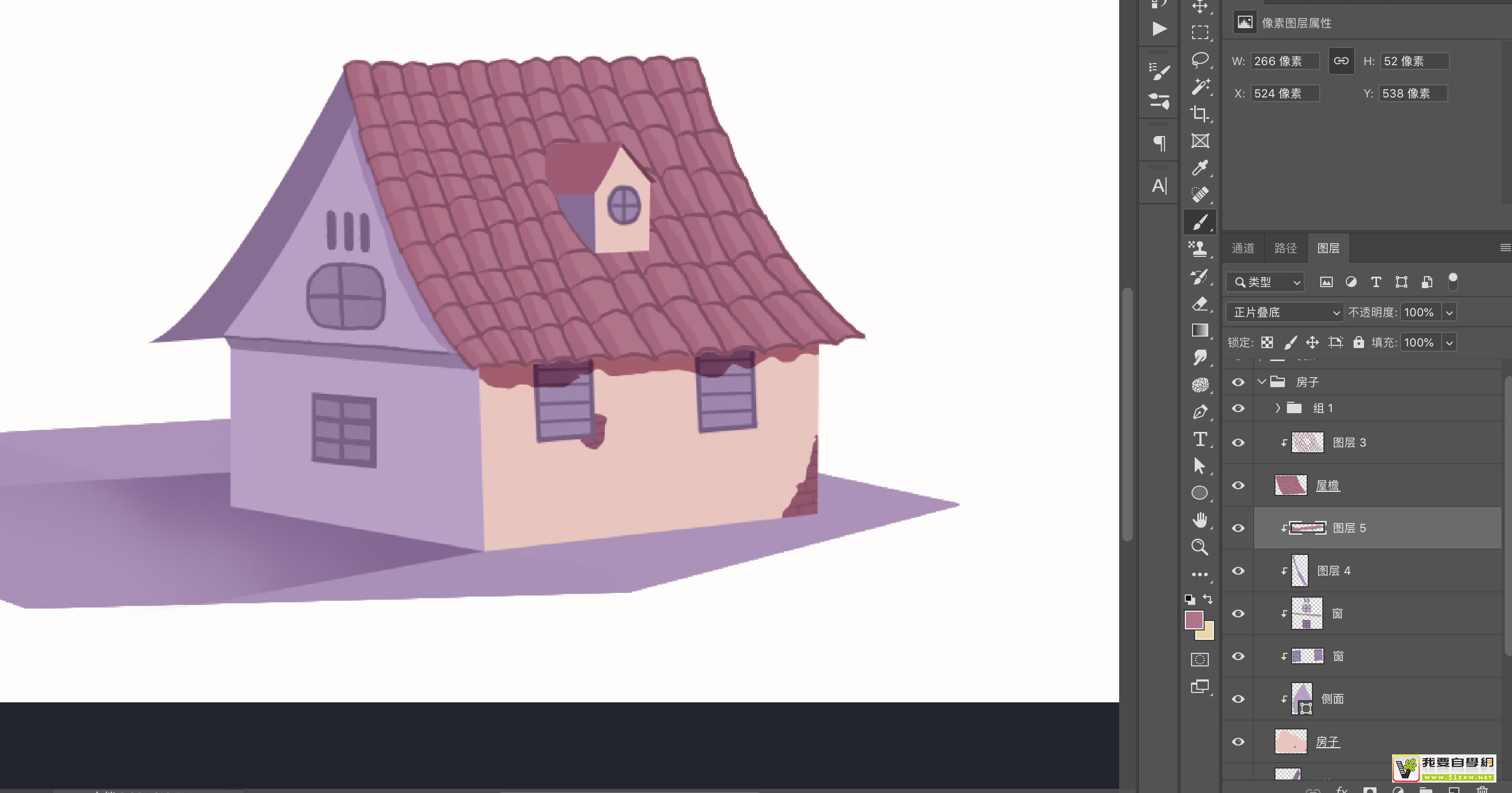 我想在屋檐下加投影,这里比较复杂,有窗户和墙壁,这时用前面那种同色系方法加投影就比较麻烦了,那么正片叠底就可以用上: