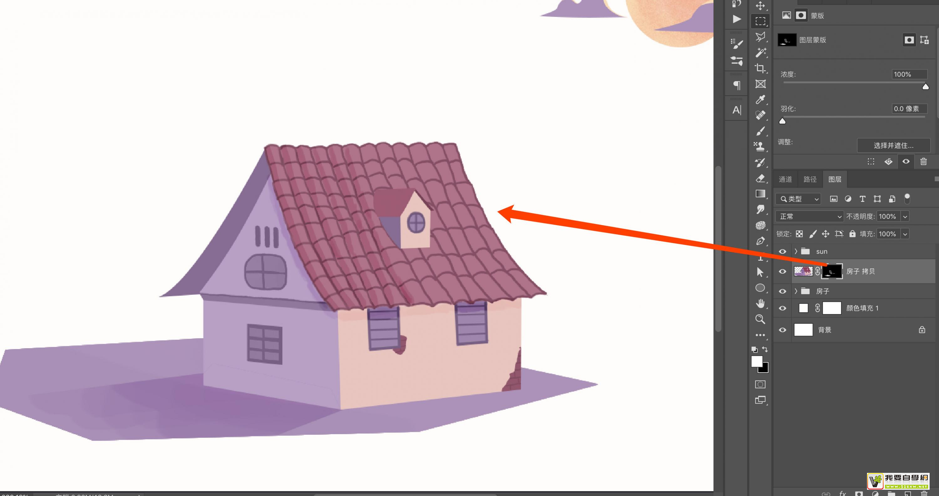 - 因为投影是从实到虚的,接近房子的比较深,距离越远越模糊,所以要进行投影虚化调整,我们加个蒙版,然后按G(选择渐变工具)在蒙版上拉一下黑白渐变(黑色隐藏,白色显示),