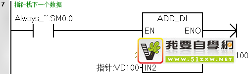 程序段5中的VD100在上一个循环已经指向了VB2开始的地址,在这个循环是加上2则VD104的数据指向VB4开始的地址。程序段6中*VD104(VW4)的数据与*VD100(VW2)的数据进行比较得到依次再循环。