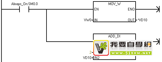 (3)写入指针与指针偏移,把VW0当前循环次数存放到指针指向的VW100地址里,在通过加法指令把VW100 2=VW102,这里为什么要加2呢?是因为既然是循环字,字由两个字节组成,所以加2是为了依次排序下去。