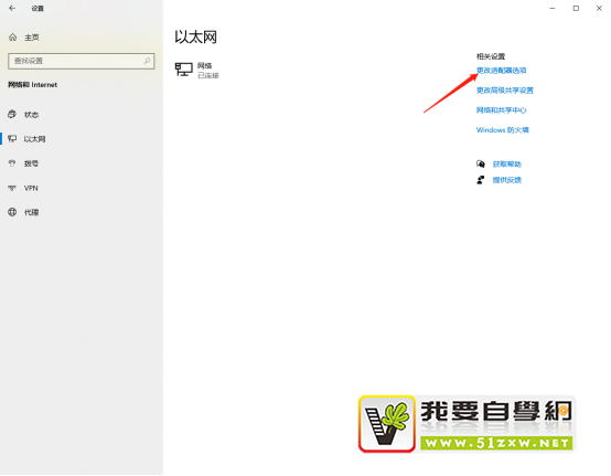 ①通过系统“设置”进入“以太网”画面,点击“更改适配器选项”