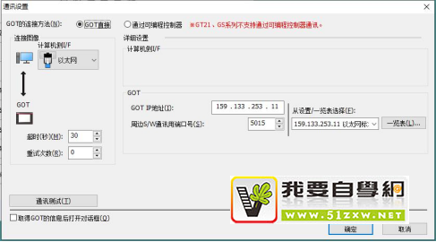 ⑤ 选择以太网连接-à输入GOT IP地址,点击通讯测试确认是否通讯成功;