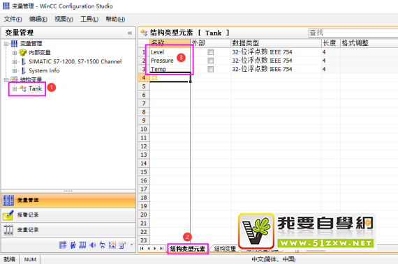 在变量管理器中创建结构类型,并为结构类型创建结构类型元素,如图 1 。