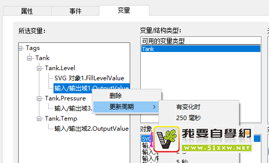 5. 把“输入/输出域1”的“OutputValue”对象属性拖拽至“Tank.Level”下;