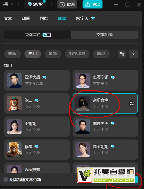 选中已添加的字幕,点击右侧工具栏的“朗读”按钮。