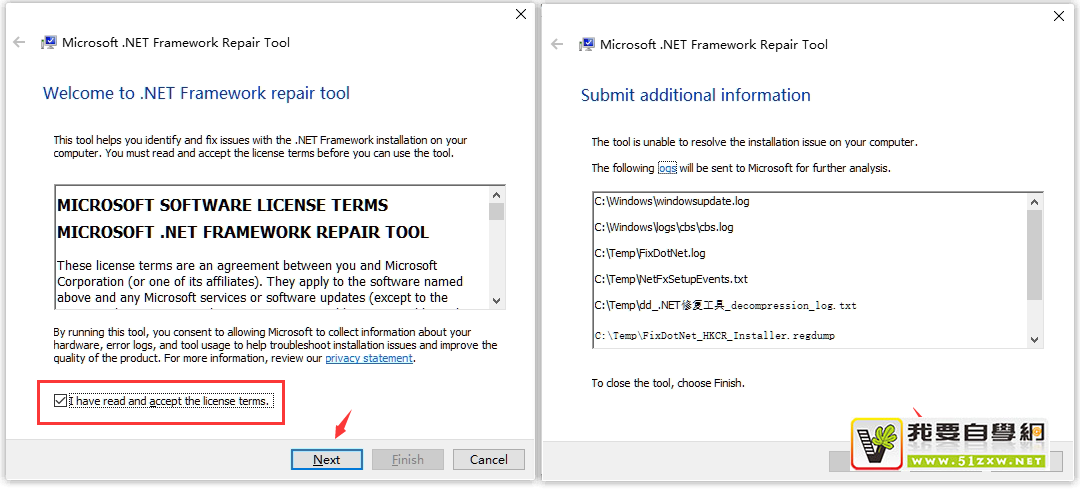 3.下载.NET修复工具双击运行程序;勾选“I have read and accept the license terms”后点击“NEXT”接下来的提示都选择“NEXT”直到修复完成点击“Finsh”