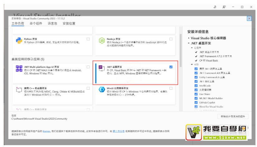 安装很简单,只需要勾上.NET桌面开发即可,其他需要再补。