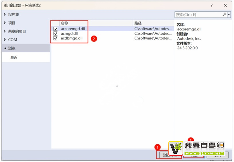 浏览到软件安装位置,找到accoremgd.dIl、acmgd.dIl、acdbmgd.dIl,选中确定,如果你CAD默认安装的话,位置在C:ProgramFiles\Autodesk\AutoCAD2024\如果不是默认安装找到你安装位置即可。