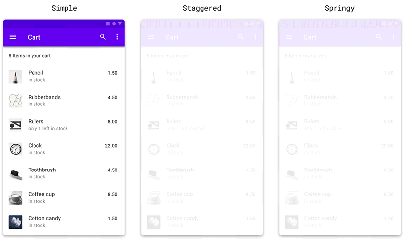 Easing描述了动画加速和减速。大多数导航过渡使用Material的标准缓动,这是一种不对称的缓动类型。这意味着元素会快速加速运动,然后缓慢减速以将注意力集中在动画结束时。这种类型的缓动为动画提供了自然的感觉,因为现实世界中的物体不会立即开始或停止移动。如果动画看起来很僵硬或死板,那么可能是由于你选错了缓动类型。