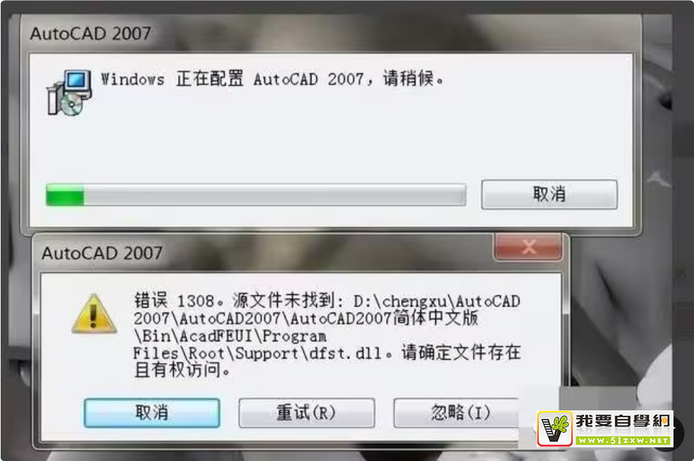 1、现象:打开AutoCAD发现有代号为1308的错误