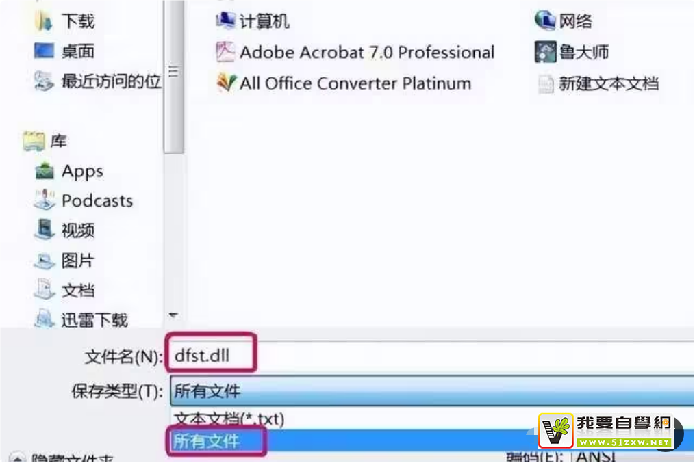 4、点击另存为dfst.dll的文件后,注意格式为所有文件,直接放在桌面上,可以看到桌面上多了个dll类文件。