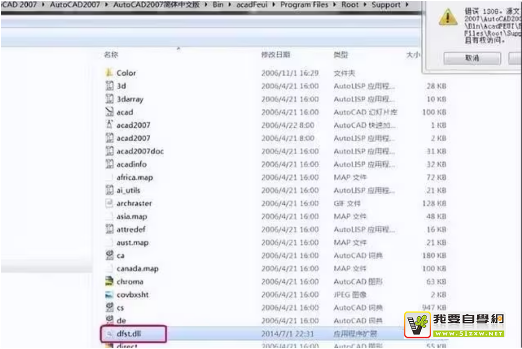 7、在空白处右键单击‘粘贴’,可以发现文档里就有了dfst.dll文件了,再次打开CAD就没有错误 1308的提醒了。