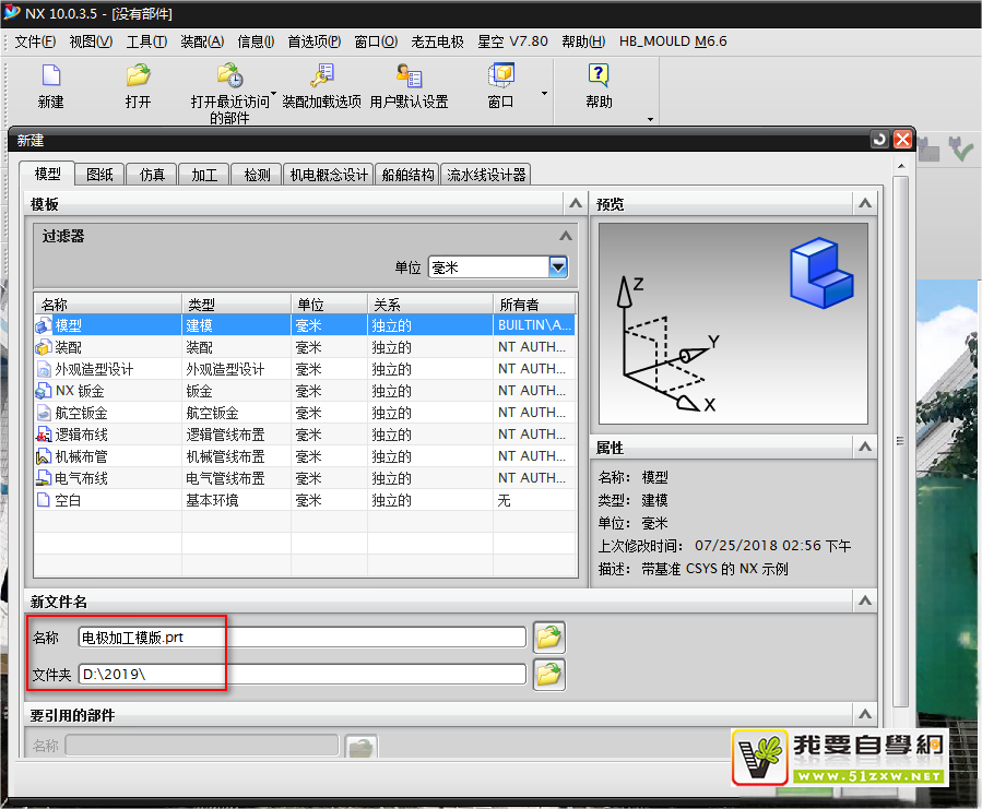 1、打开NX软件,新建一个空的图档,名称很重要,要简单明了,10.0版本可以使用中文名字,如下图所示: