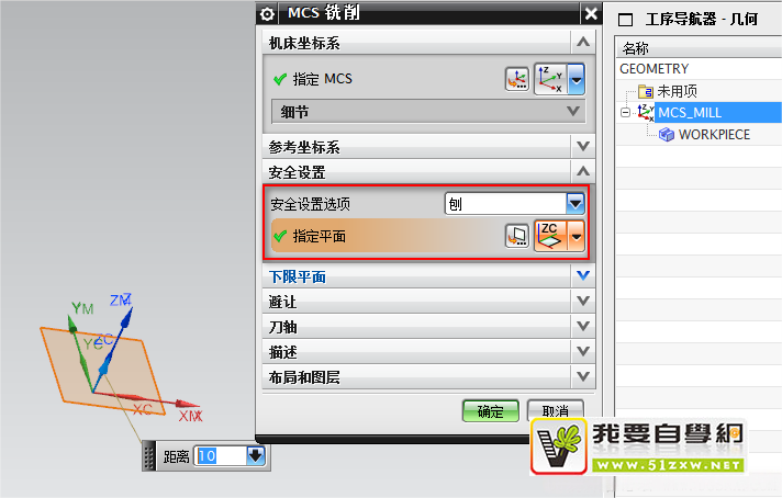 3、在加工界面中,先设置坐标【MCS-MILL】和【WORKPIECE】,【MCS-MILL】设置默认的安全高度,【WORKPIECE主】要设置一个初始的毛胚,以后只要用此模板就会自动加载,如下图所示:
