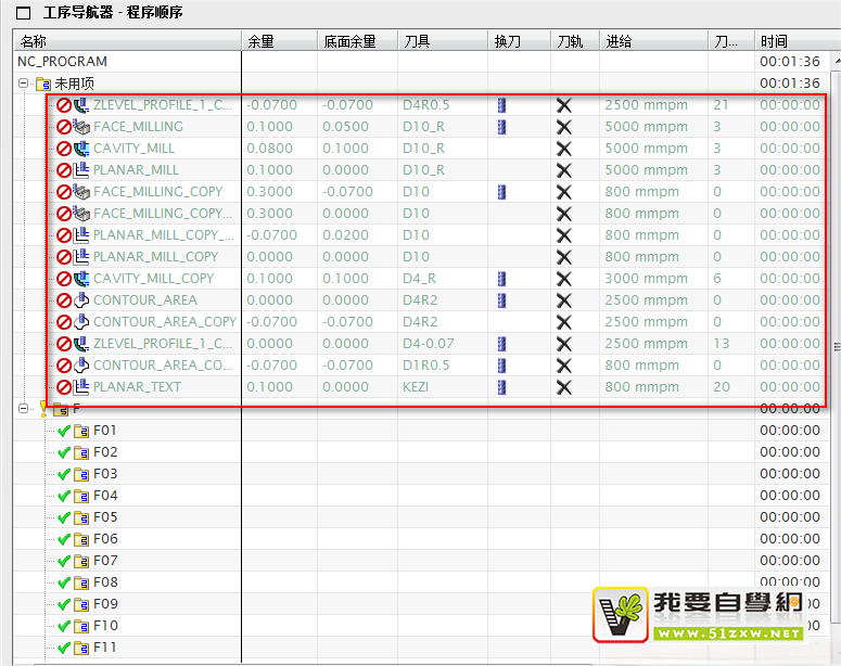 6、程序组创建完成以后,下面就要创建我们常用的加工工序了。可以按照想要的加工思路来创建,这里的工序参数一定要设置好,后续就不用再改来改去了。包含转速进给余量公差都可以设置好,如下图所示: