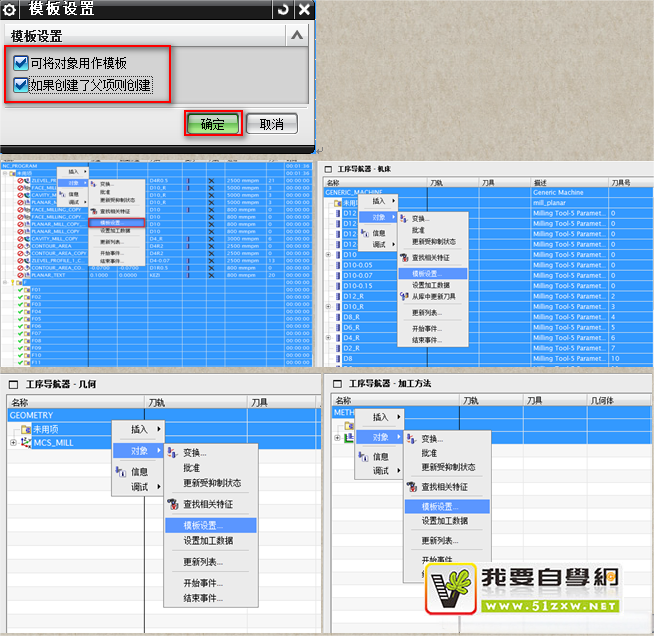 7、设置好加工策略、加工刀具、安全高度与几何体。接下来最重要的步骤,此步骤一定不能忘。每个视图我们都要进行模板设置。如下图所示: