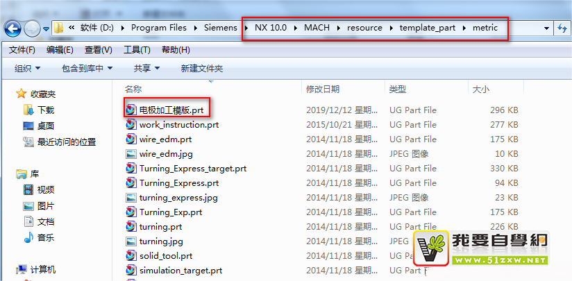 9、找到NX10.0模板图档PRT放置位置,路径为:(X:\Program Files\Siemens\NX 10.0\MACH\resource\template_part\metric )然后把我们创建好的图档复制在这里面,如下图所示: