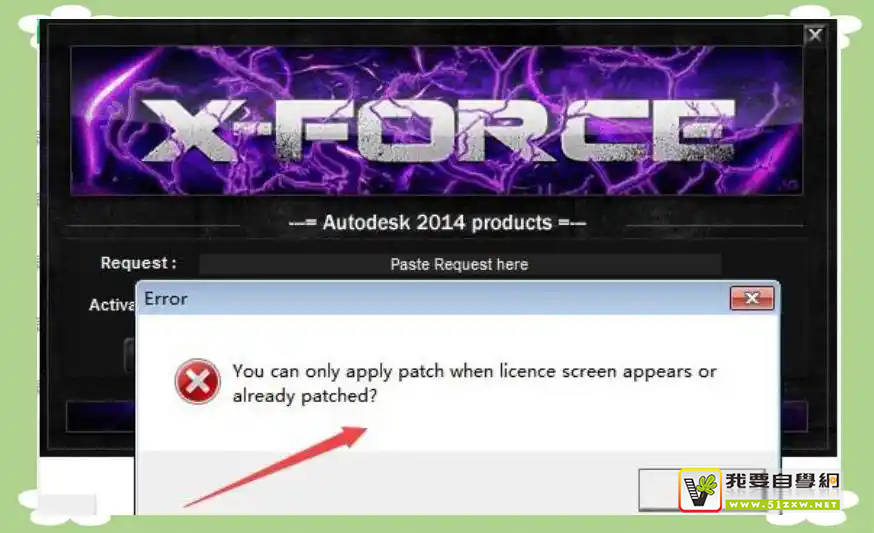 在激活CAD时,我遇到了一个错误提示,即在打开CAD注册机并点击patch后,出现了lol的错误提示,随后又出现了“You can only apply patch when licence screen appears or already patched”的错误信息。