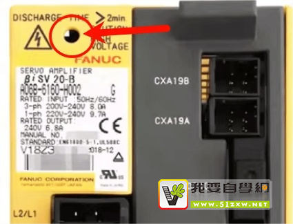 这款驱动器的控制电源为DC24V,通过CXA19B接口引入,驱动器的电源指示灯在编码器JF1接口位置的右侧侧板上,正面查看不太容易观察到,要从左侧看就会看到是有LED指示灯显示的,指示灯共有三个,最下面的指示灯就是控制电源指示灯了,指示灯为绿色。