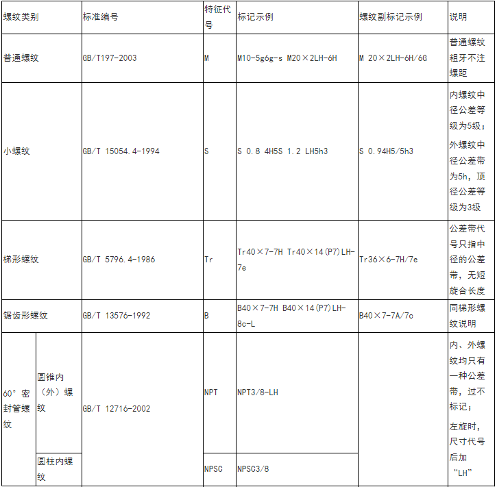上述普通螺纹的标记规定中,还需说明的是:粗牙螺纹不注螺距,右旋时不注旋向;中径和顶径公差带代号相同时只注一次(如6H);旋合长度共分三组,即长(L)、短(S)和中等(N),中等旋合长度可省略标注N。
