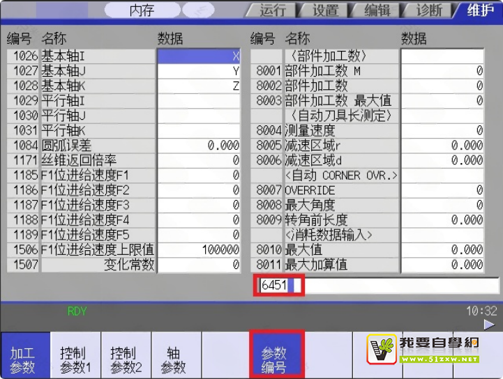 首先在“MAINTE(维护)”画面下输入密码“MPARA”,密码输入完成后,系统打开修改参数权限,再进入到“参数”画面,点击“参数编号”输入“6451”后点击MDI键盘上“INPUT”键,开始搜索参数6451;