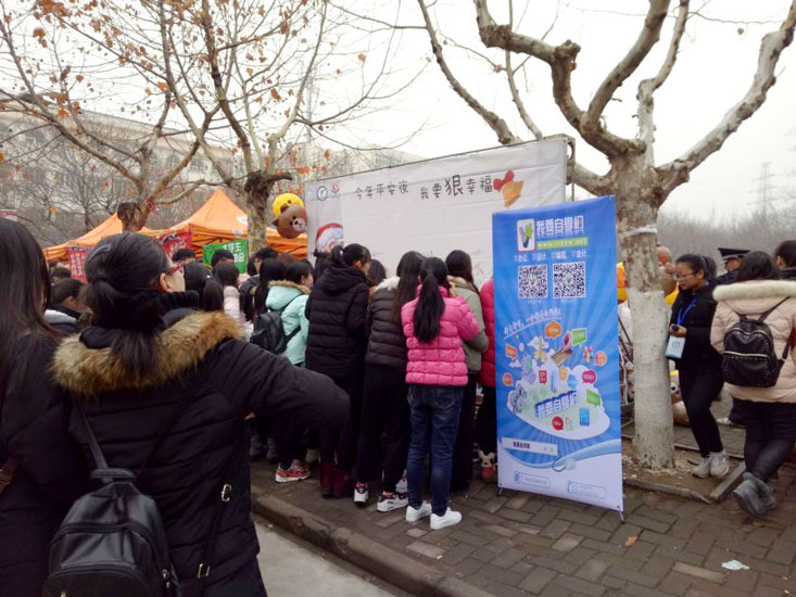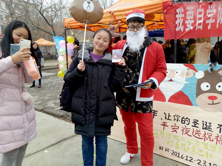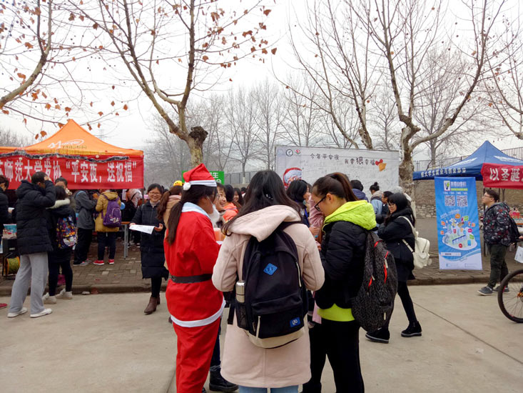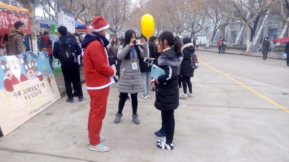 这次我们来到了江苏省师范大学,与同学们一起举行"平安夜,送祝福"活动,活动现场气温虽然有点低,但丝毫没有减少同学们的热情。